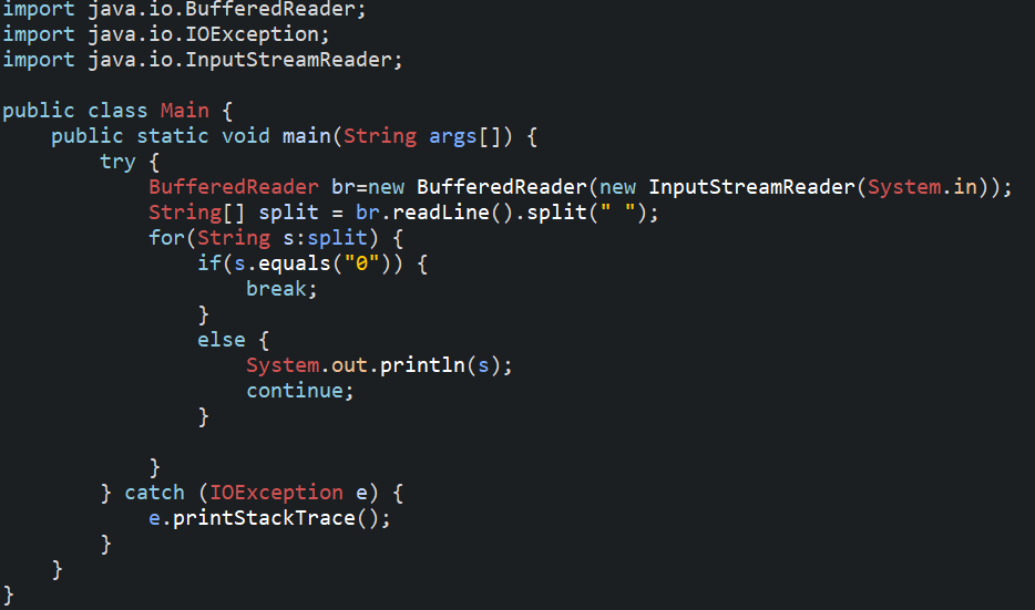 입력된 정수를 줄을 바꿔 하나씩 출력하는데, 0이 입력되면 종료한다.