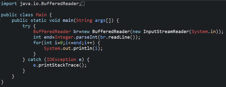 0부터 그 수까지 줄을 바꿔 한 개씩 출력한다.