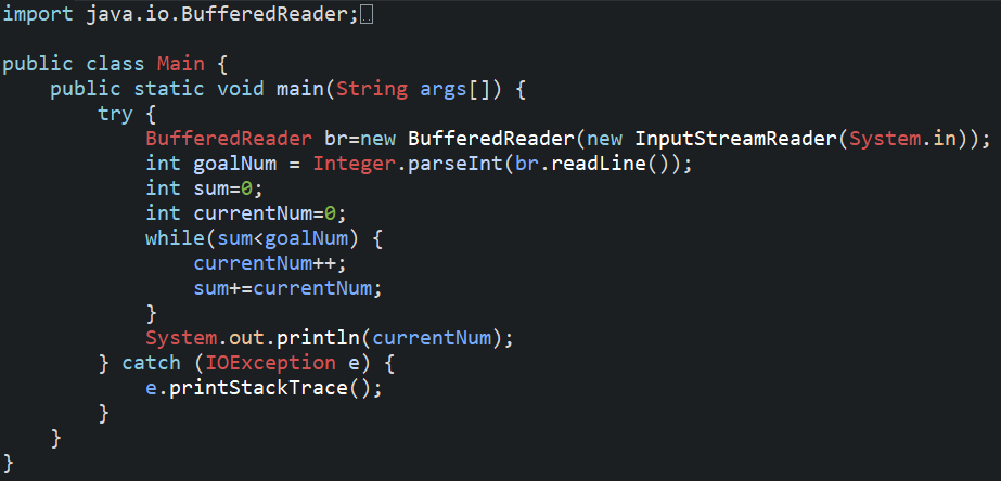 1, 2, 3, 4, 5 ... 를 순서대로 계속 더해 합을 만들어가다가,입력된 정수와 같거나 커졌을 때, 마지막에 더한 정수를 출력한다.