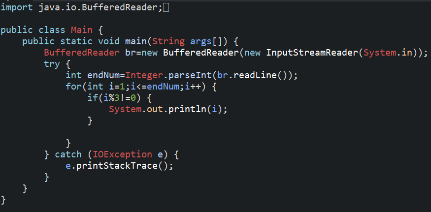 1부터 입력한 정수보다 작거나 같을 때까지 1씩 증가시켜 출력하되3의 배수는 출력하지 않는다.