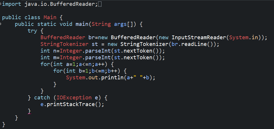 나올 수 있는 주사위의 숫자를 한 세트씩 줄을 바꿔 모두 출력한다.첫 번째 수는 n, 두 번째 수는 m으로 고정해 출력하도록 한다.