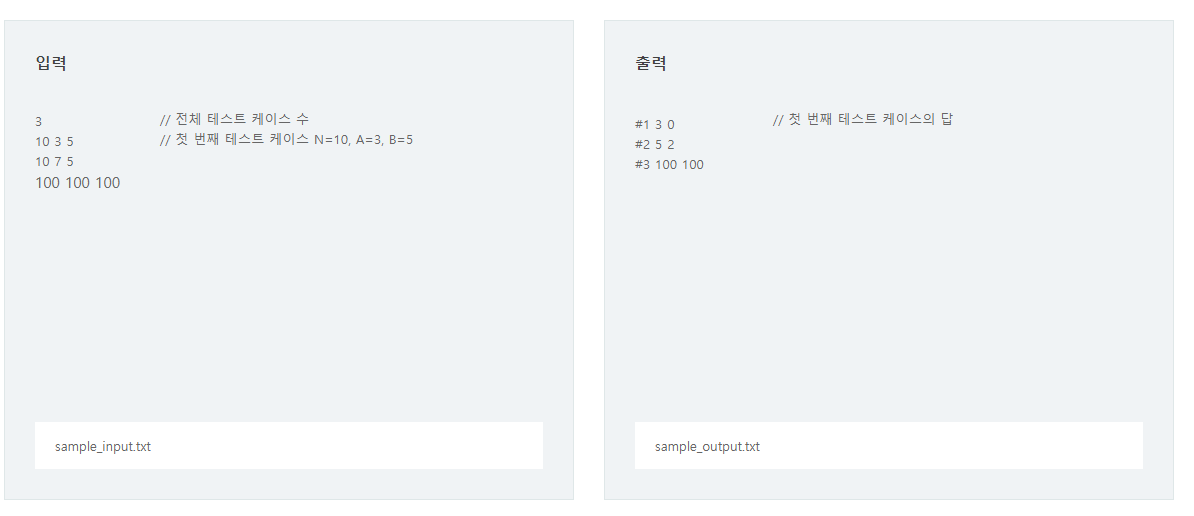 각 테스트 케이스의 첫 번째 줄에는 세 개의 정수 N (1 ≤ N ≤ 100), A, B (0 ≤ A, B ≤ N)이 공백 하나를 사이로 두고 순서대로 주어진다.