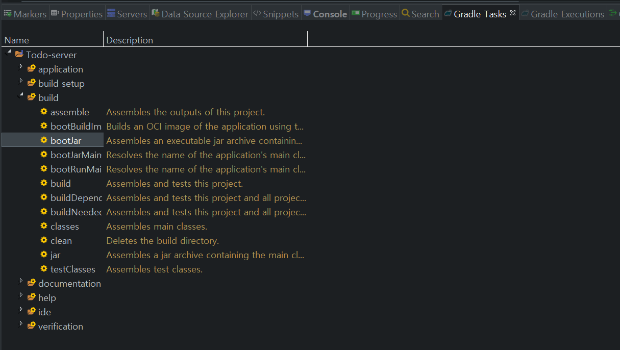 3) Gradle Tasks > build 패키징으로 이동하면 여러 형태의 Gradle 명령어를 볼수있다.