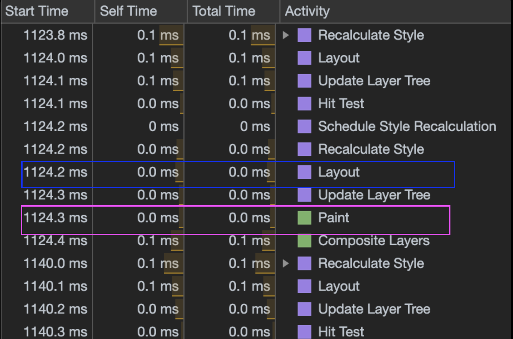 - Activity 컬럼에서 Layout 2번째부터가 Reflow, Paint 2번째부터가 Repaint 입니다.