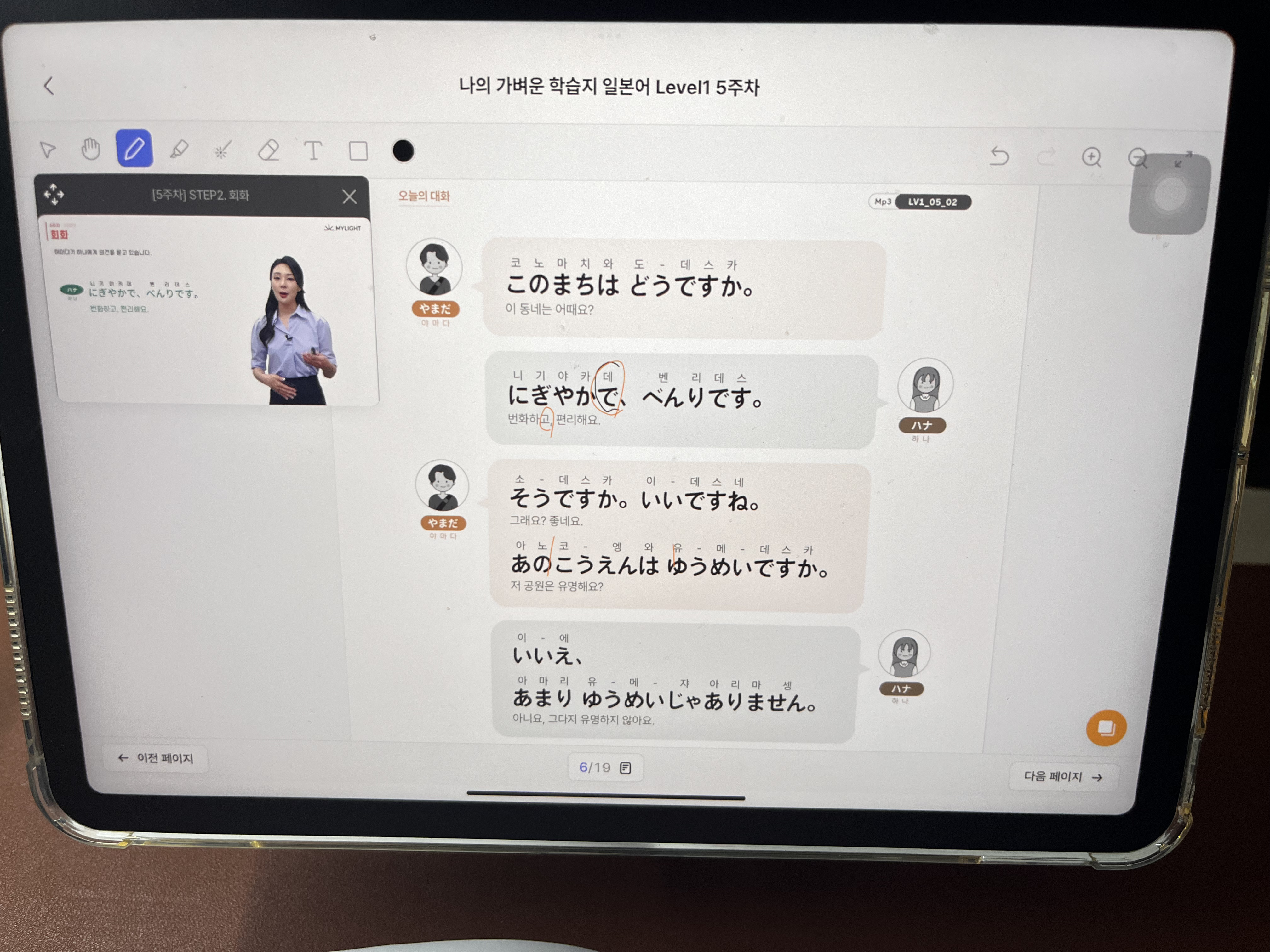 이번 주 학습 주제는 "にぎやかで、べんりです。" (번화하고, 편리해요) 였어요!