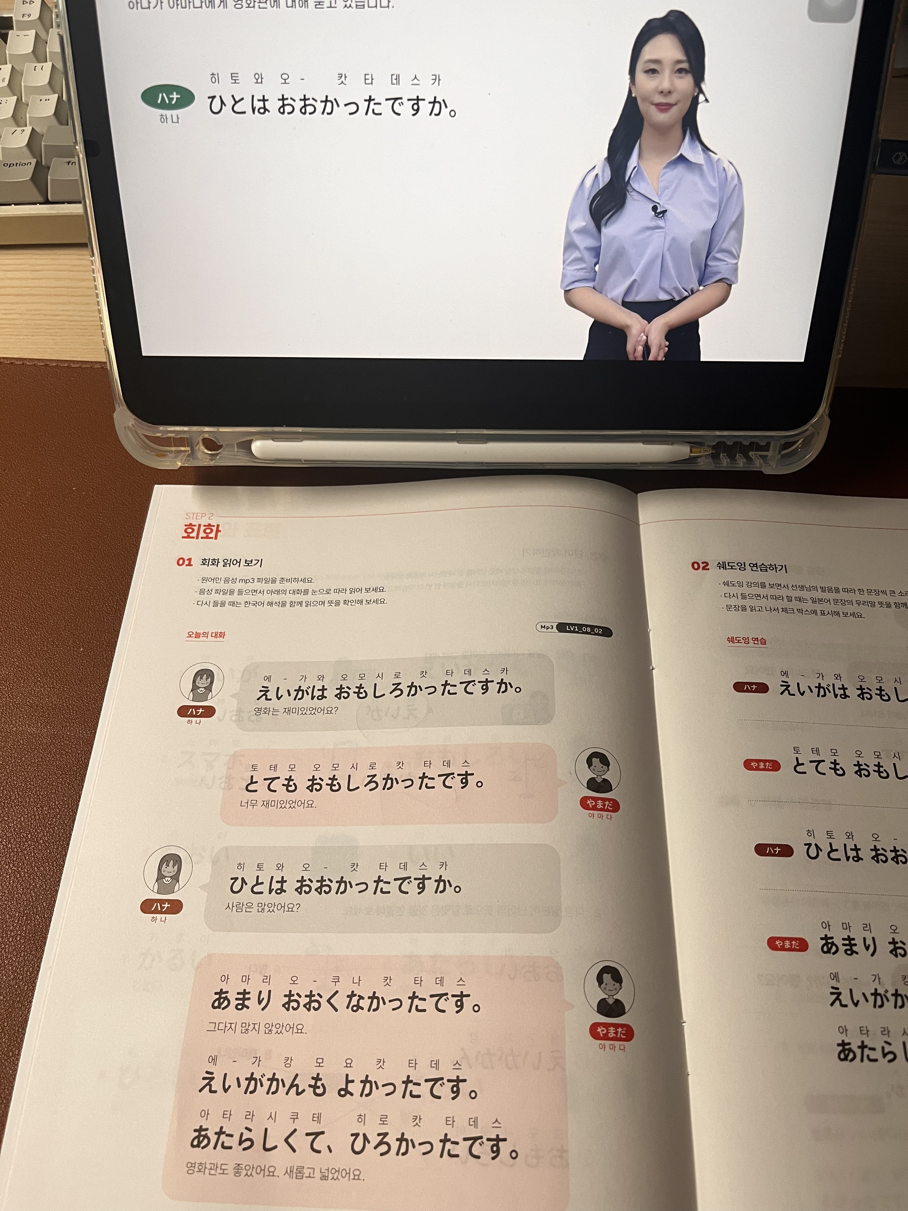 대화 속에서 "사람이 많았나요?"라는 질문을 배우면서, "ひとは おおかったですか?"(사람은 많았어요?)를 함께 연습했습니다.