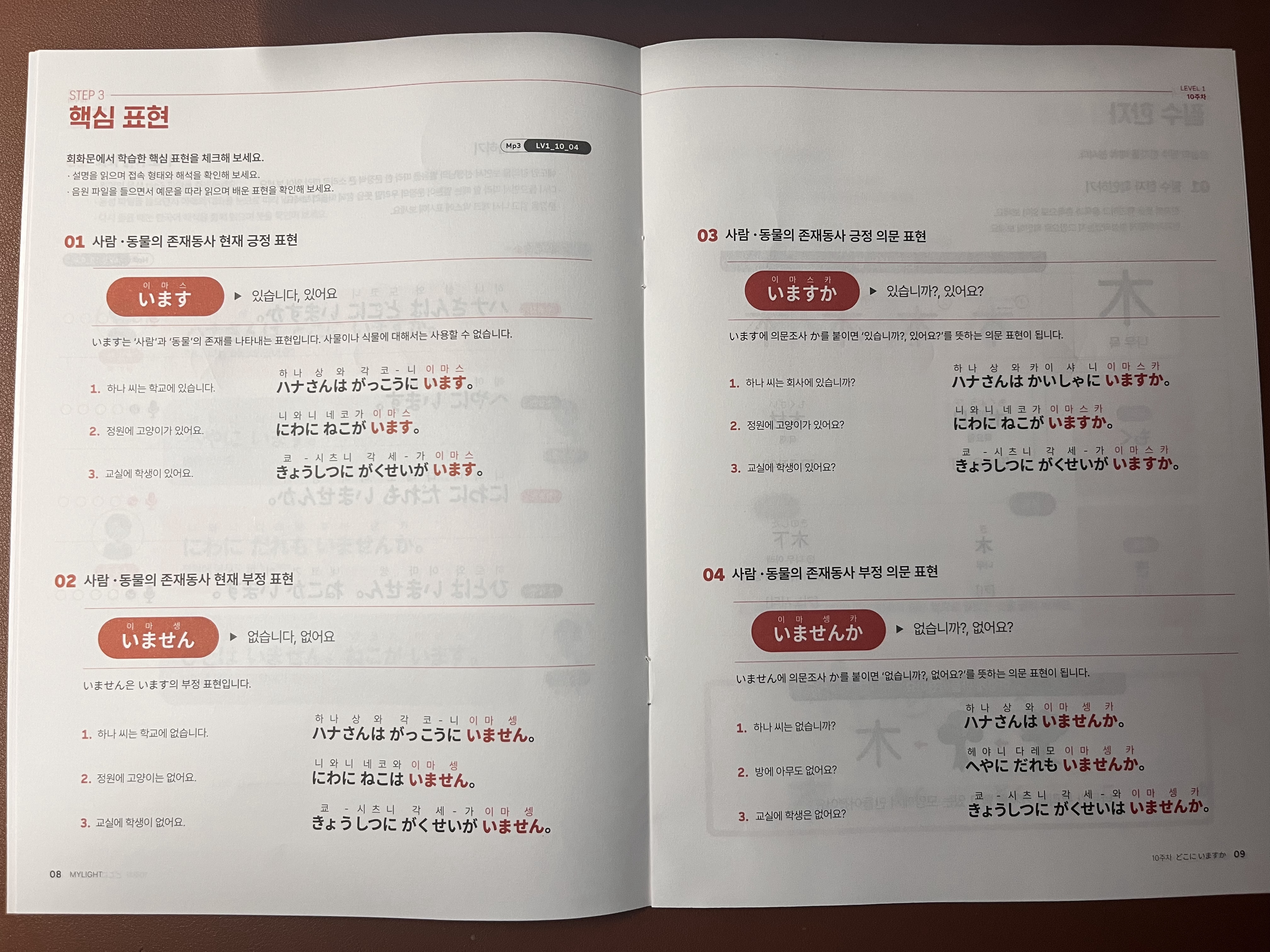 이러한 대화를 연습하면서 "います" (있습니다), "いません" (없습니다)의 활용을 확실히 익힐 수 있었다.