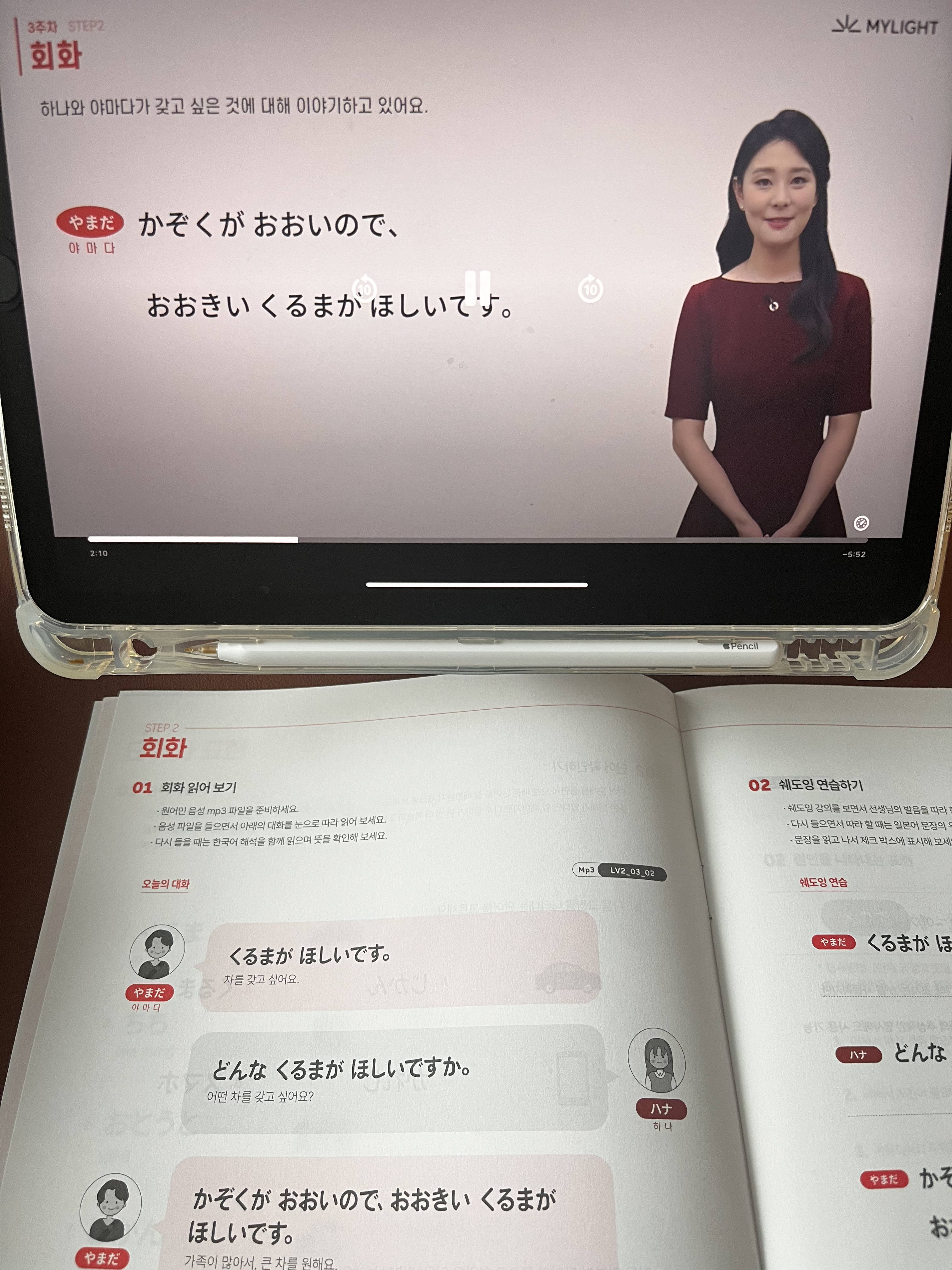 "가족이 많아서 큰 차를 갖고 싶어요." 라는 표현을 일본어로 자연스럽게 말하는 연습을 했습니다.