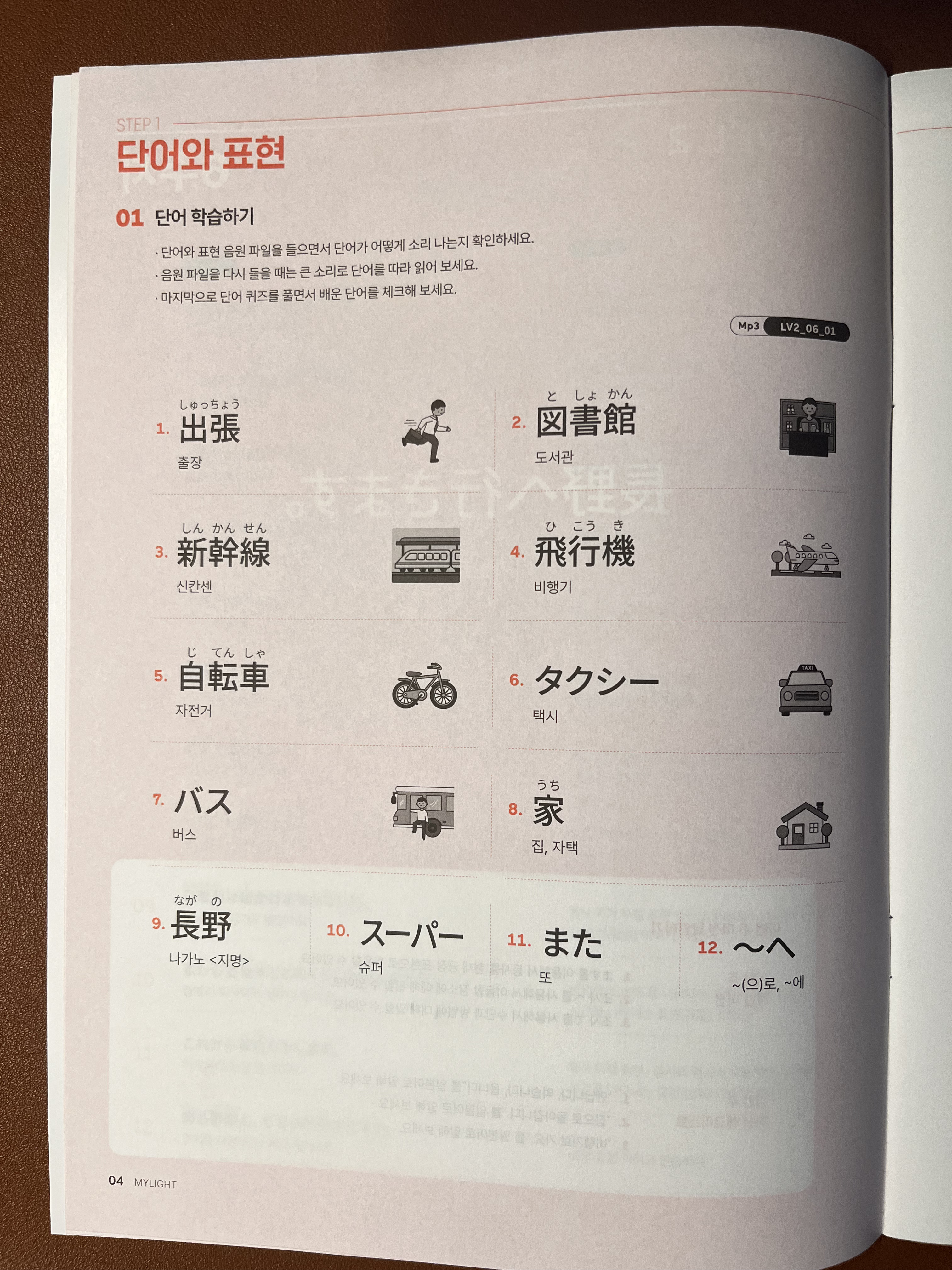 - 출장은 出張(しゅっちょう), 도서관은 図書館(としょかん), 신칸센은 新幹線(しんかんせん), 비행기는 飛行機(ひこうき), 자전거는 自転車(じてんしゃ), 나가노는 長野(ながの)라고 배웠습니다!