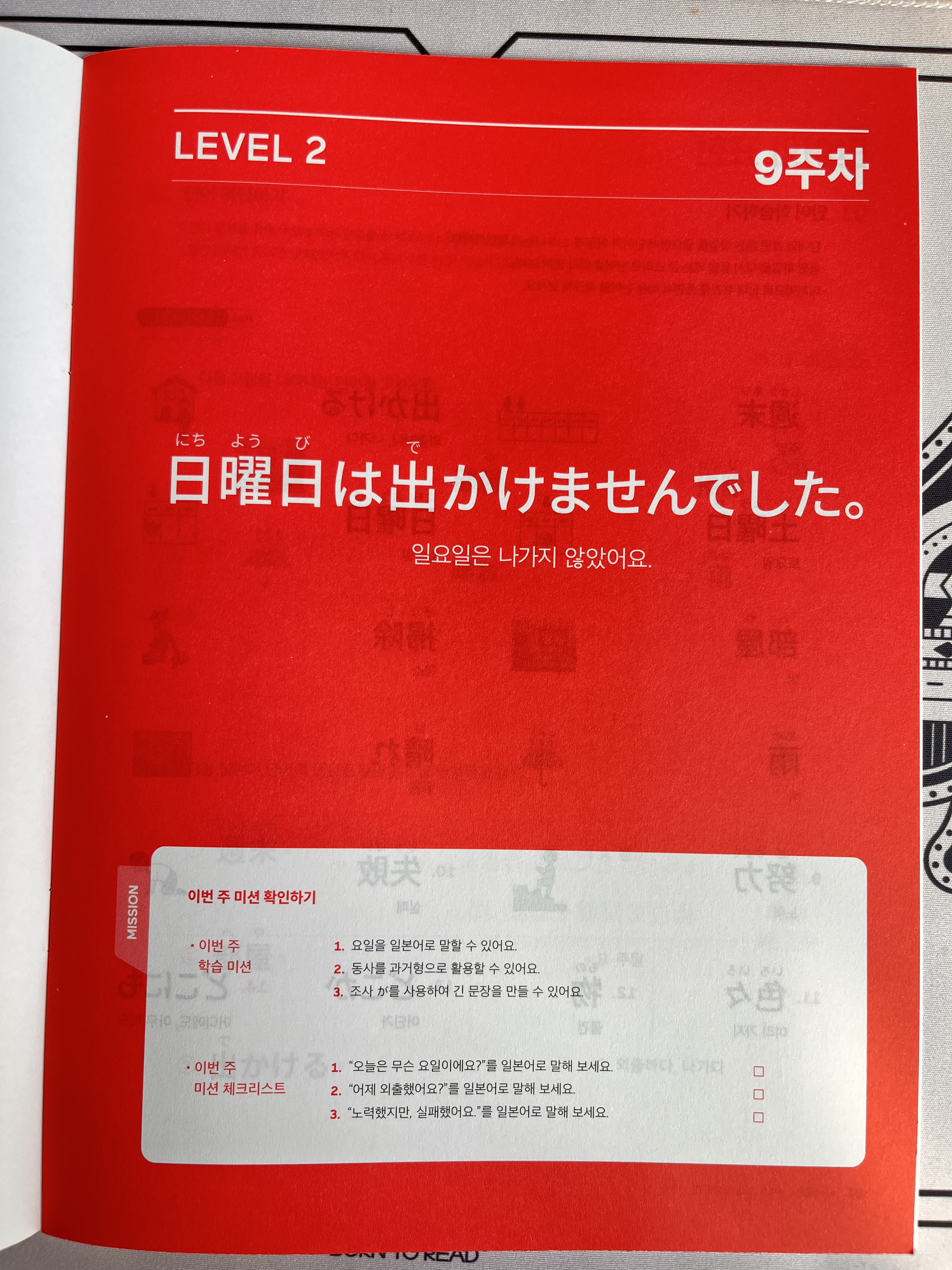 이번 주는 일요일에 무엇을 했는지, 또는 하지 않았는지를 말하는 표현을 배웠습니다. 특히 ‘~ませんでした’라는 동사의 과거 부정형이 핵심이었습니다. 일상 회화를 부정문으로 이야기할 수 있어서 더 다양하게 활용할 수 있는 표현들이 많았어요.