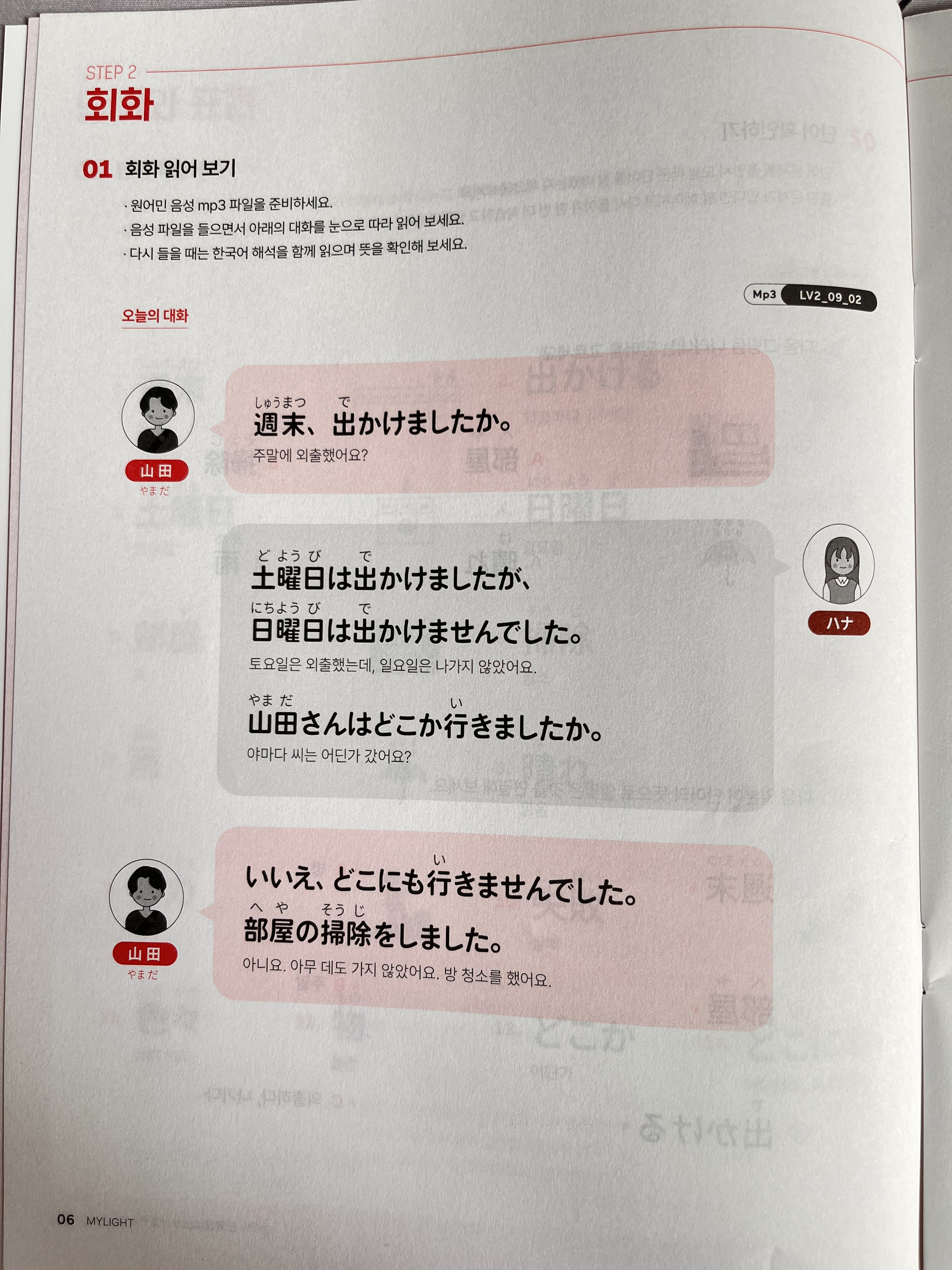 이번 회화에서는 야마다 씨와 하나 씨가 주말에 외출했는지에 대해 이야기해요.