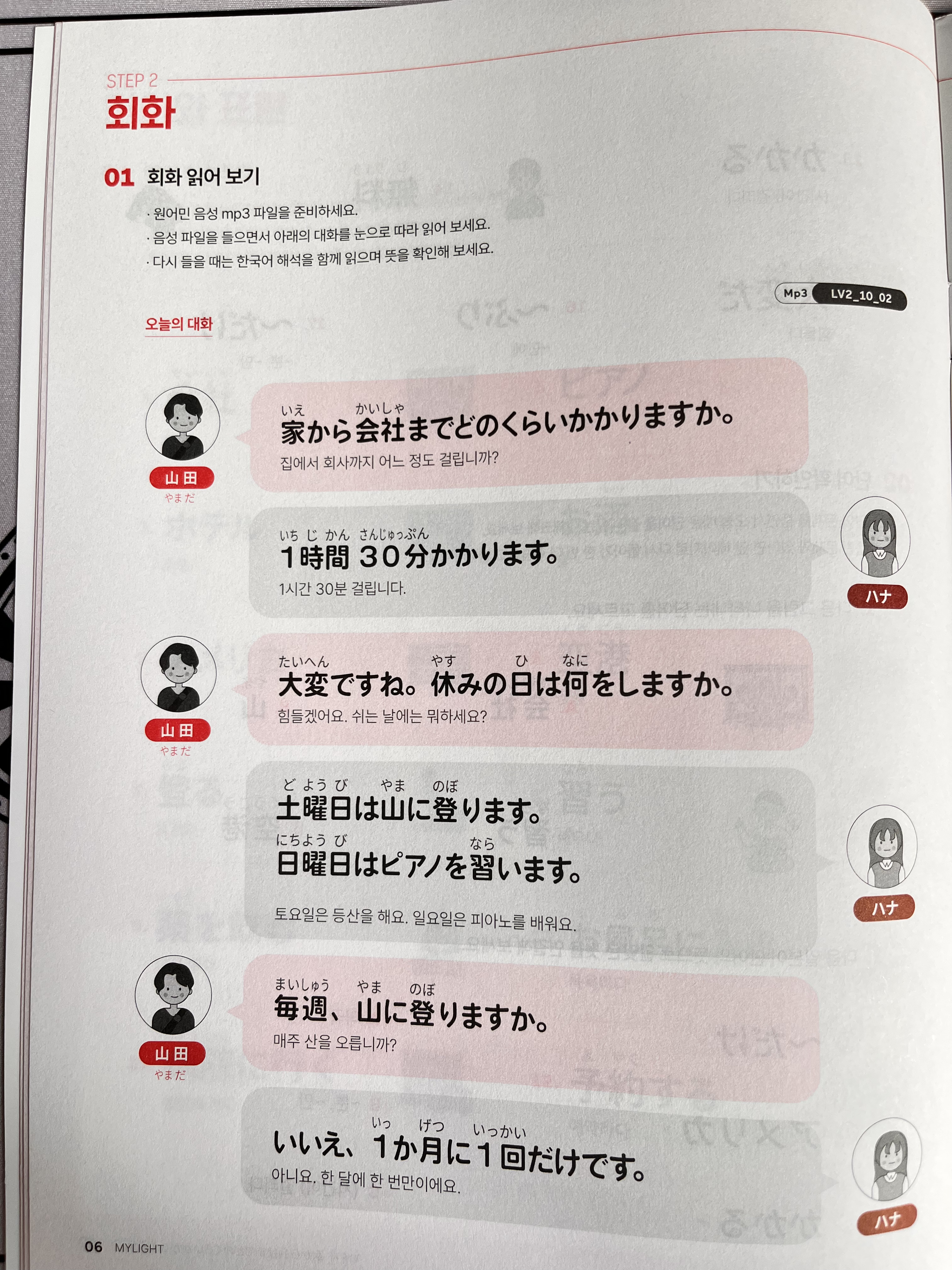 이번 주 회화는 출퇴근 시간, 쉬는 날 루틴, 그리고 “빈도” 표현을 중심으로 구성되어 있었어요.