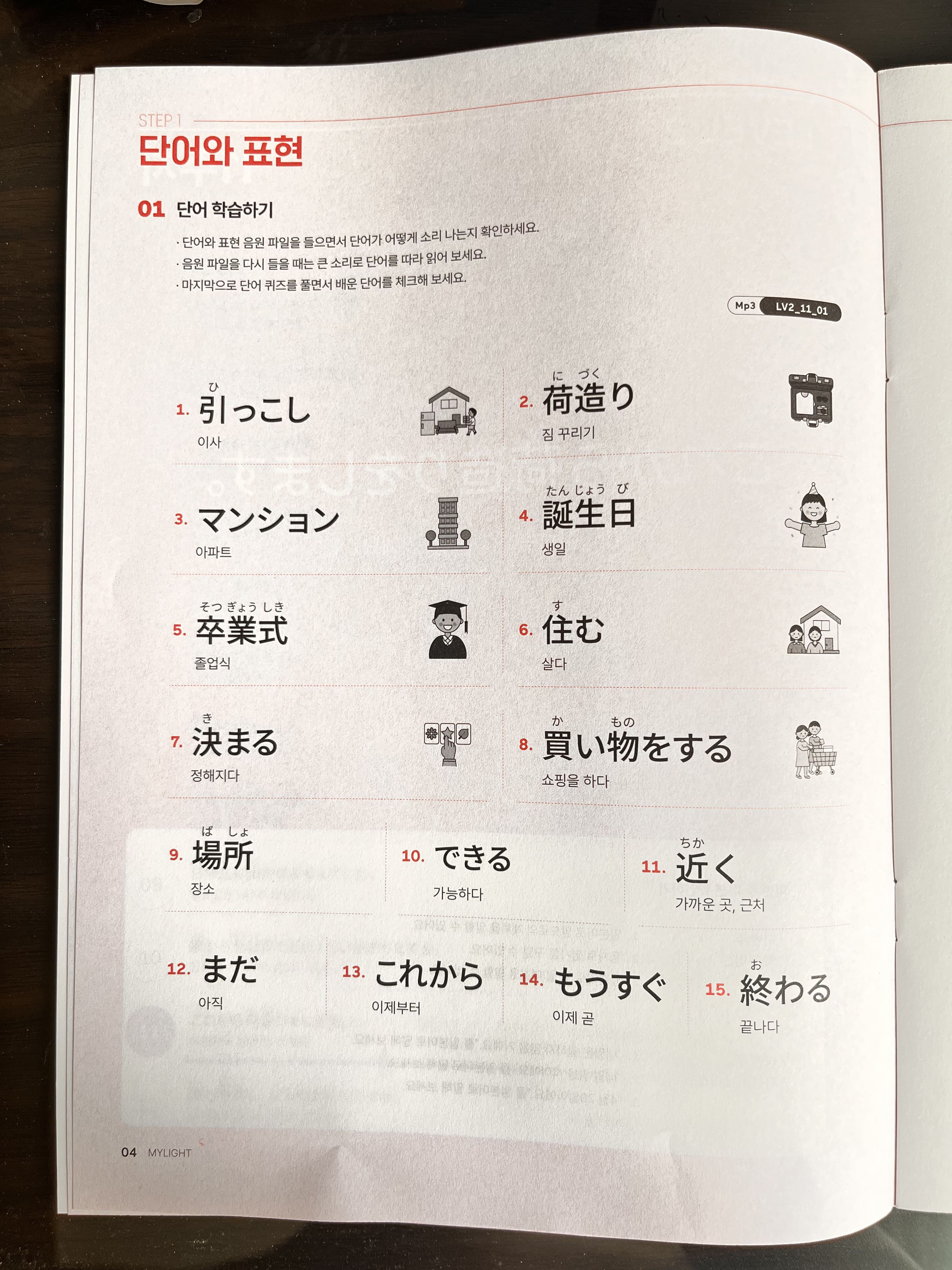 대화문에 나오는 표현 중 もうすぐですね。(이제 곧이네요) 같은 표현은 실제로 일상에서 쓰기 좋아서 바로 외웠어요.