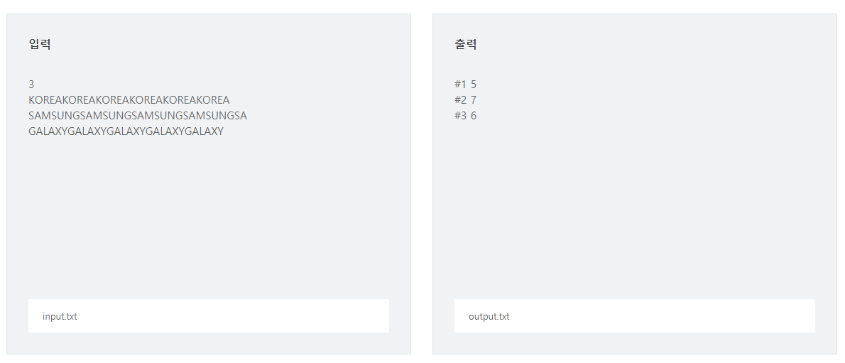 인 경우 SWEA에서 제공한 답은 KOREA 패턴으로 하는 마디 5개이나,KOREAKOREA 이렇게 또한 패턴으로 볼수있기에 애매합니다.그래서 마디의 최소값인 경우로 풀이하였습니다.문제
