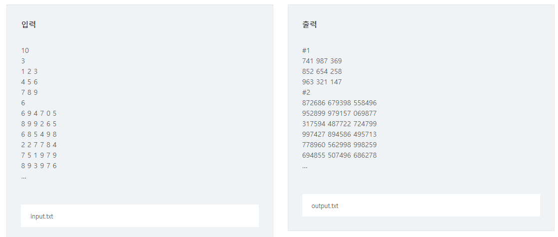 다음 N줄에 걸쳐서 90도, 180도, 270도 회전한 모양을 출력한다.
