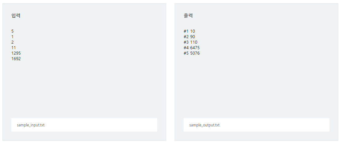 각 테스트 케이스마다 ‘#x’(x는 테스트케이스 번호를 의미하며 1부터 시작한다)를 출력하고,