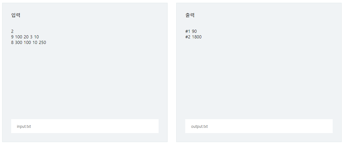 각 테스트 케이스마다 ‘#x’(x는 테스트케이스 번호를 의미하며 1부터 시작한다)를 출력하고, 종민이가 내야 하는 수도 요금을 출력한다.