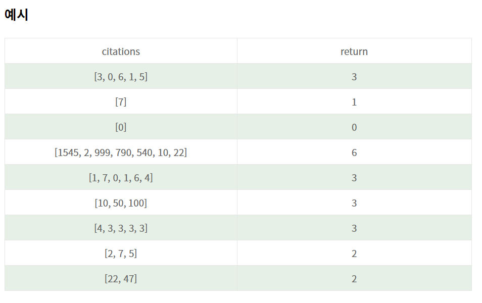 어떤 과학자가 발표한 논문 n편 중, h번 이상 인용된 논문이 h편 이상이고 나머지 논문이 h번 이하 인용되었다면 h의 최댓값이 이 과학자의 H-Index입니다.