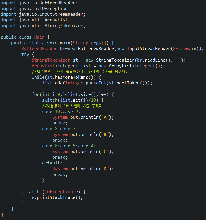 평가를 문자(A, B, C, D, ...)로 입력받아 내용을 다르게 출력해보자.