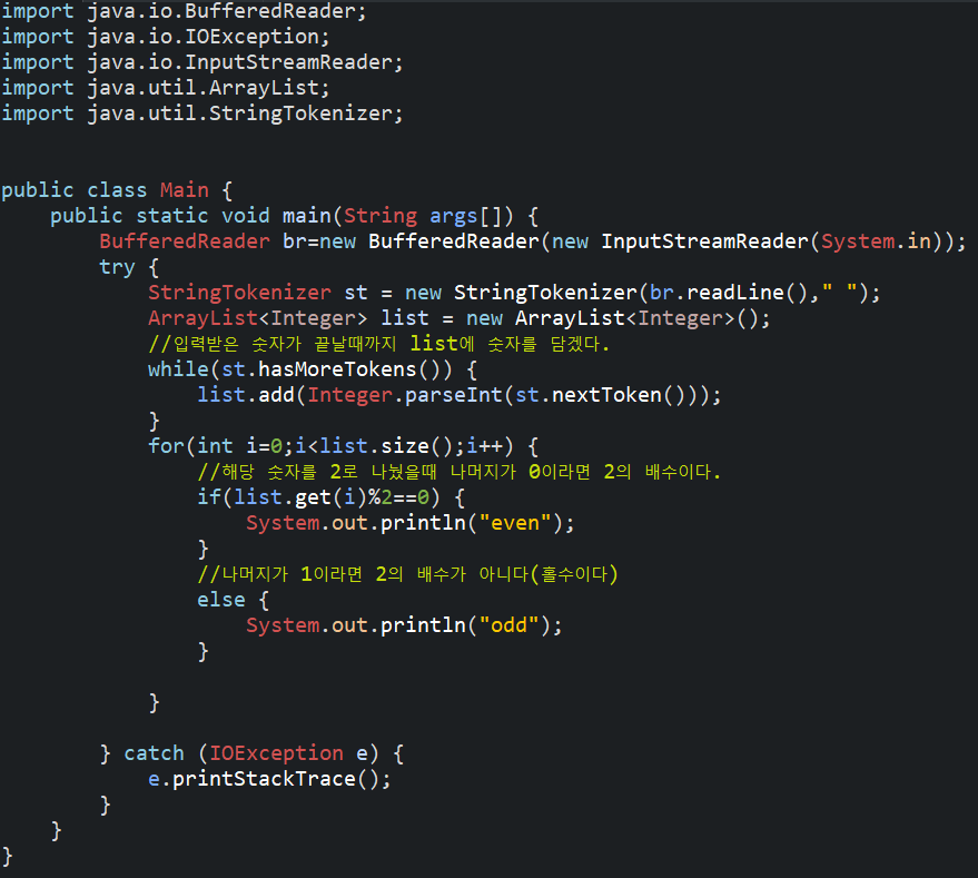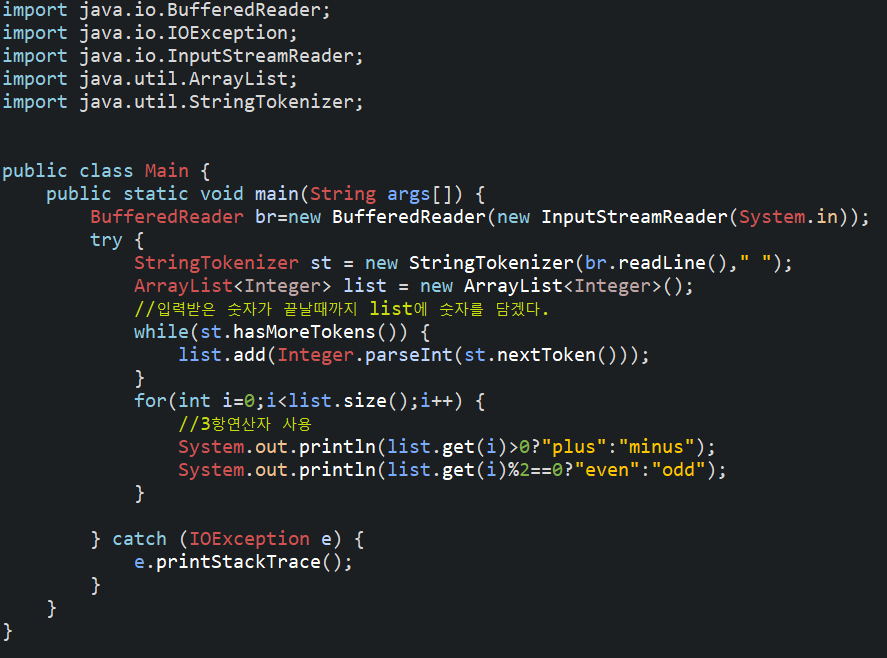 정수 1개가 입력되었을 때, 음(minus)/양(plus)과 짝(even)/홀(odd)을 출력해보자.